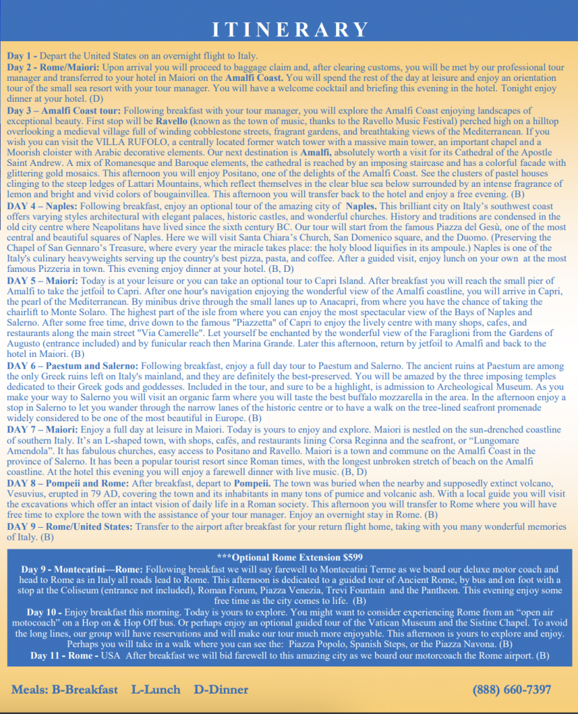 NOT INCLUDED IN PRICE: Optional 2-night Rome Post Tour Extension ($599) and Travel Insurance.